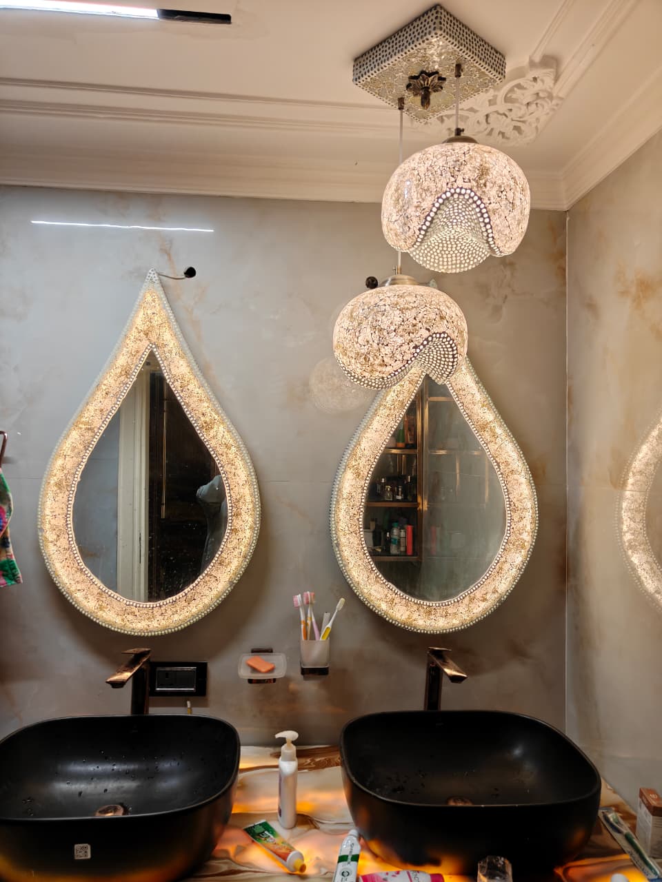 Inspired by the artistic language of mosaic composition, these mirrors combine decorative brilliance with practical functionality. The surrounding crystal structure enhances the mirror’s presence, allowing it to become both a visual centerpiece and a source of gentle illumination.